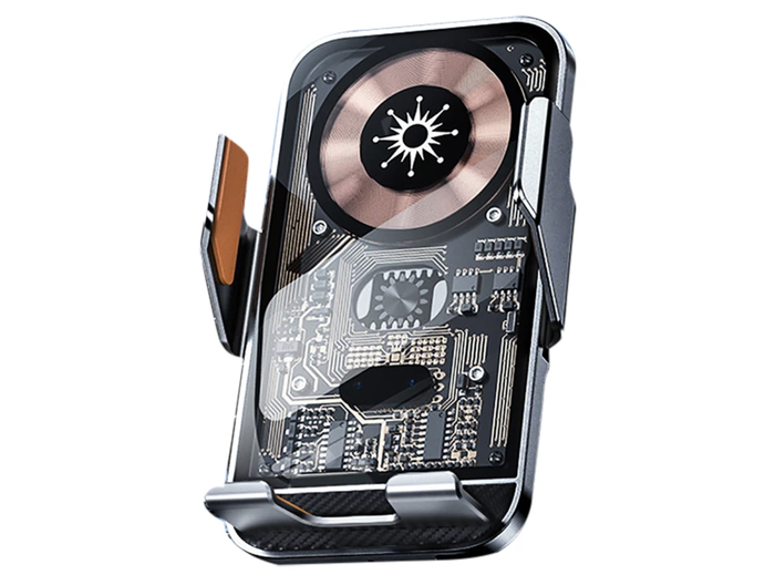Интеллектуальный держатель для телефона с автоматическим захватом и инфракрасным датчиком. Совместим с iPhone, Samsung и Xiaomi. Обеспечивает быструю зарядку, безопасное крепление и удобство во время поездок.