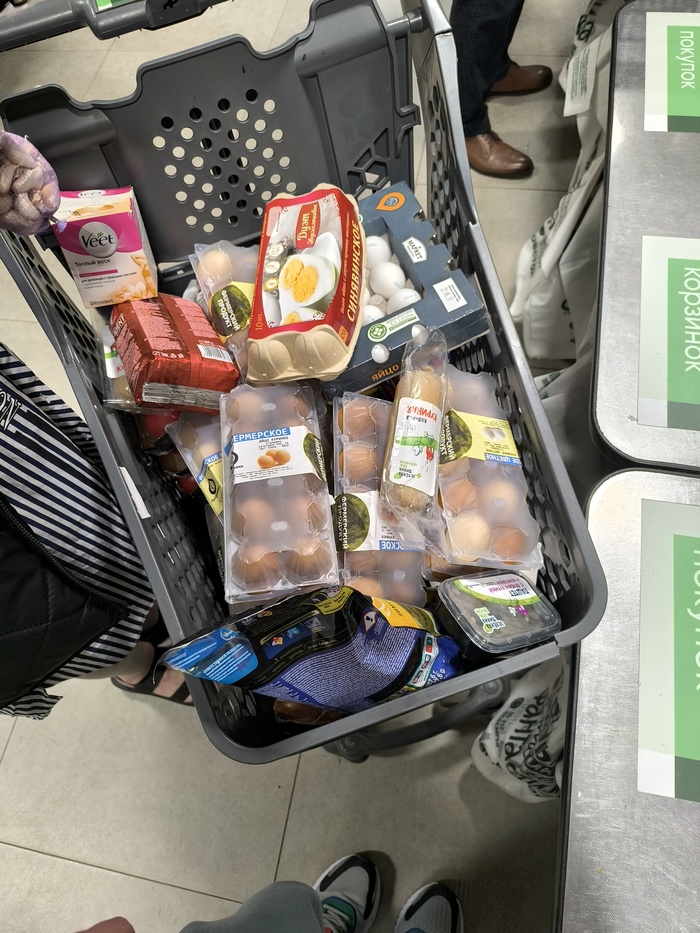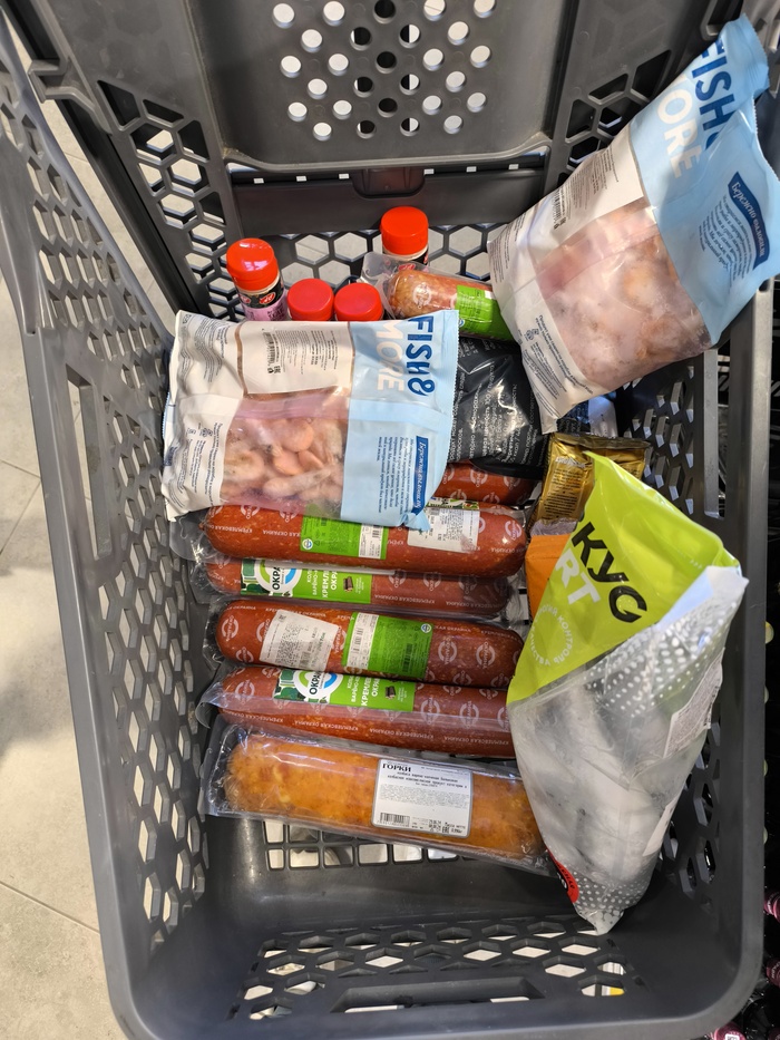В попытке визуально уменьшить количество тухлятины. Работники собирали "мелкоштучный" товар в отдельную корзинку, а я отдельно в тележку. Итог на фото.