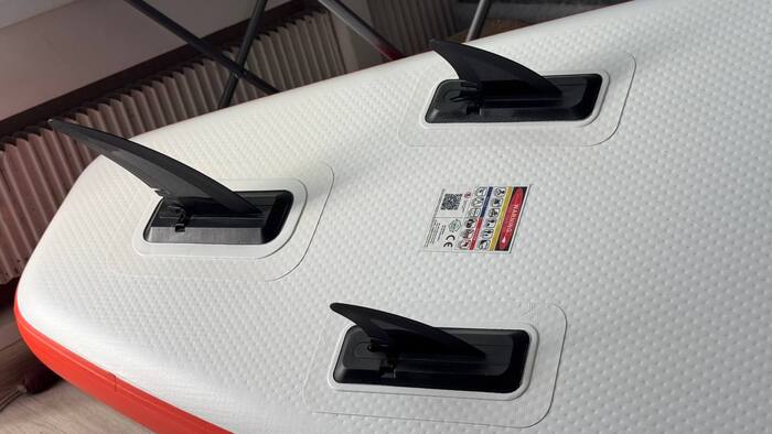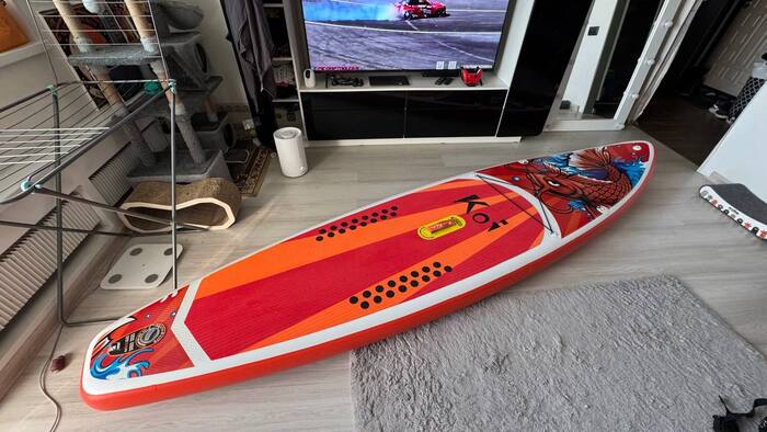 Сапборд вроде толстенький, ровненький, внешнее исполнение очень приятное. Нескользячка плотная, швы выглядят уверенно, клапан не травит. Стоял 3 суток в накачаном виде - чуть спускает, но вообще не критично, заметила только по манометру на насосе.