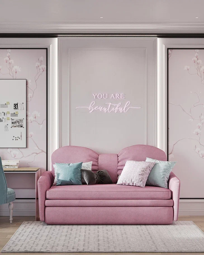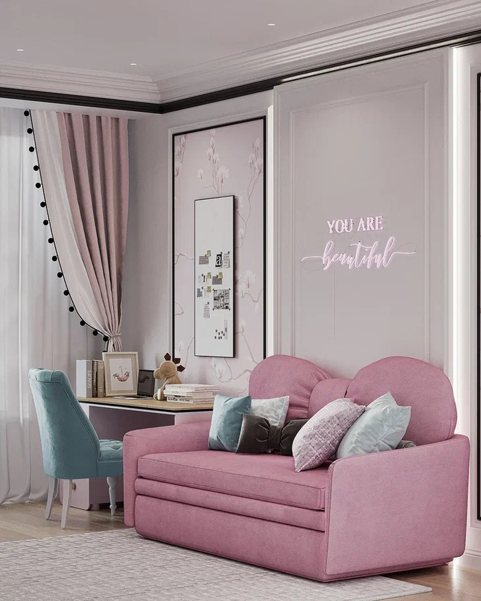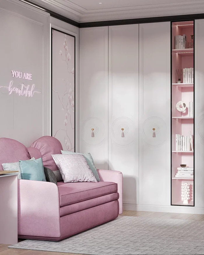 Детская комната выполнена в светлой палитре с пудрово-розовыми оттенками и мягкими акцентами. В пространстве предусмотрены все необходимые зоны: диван-кровать, рабочий стол у окна и вместительные системы хранения, встроенные в стены.