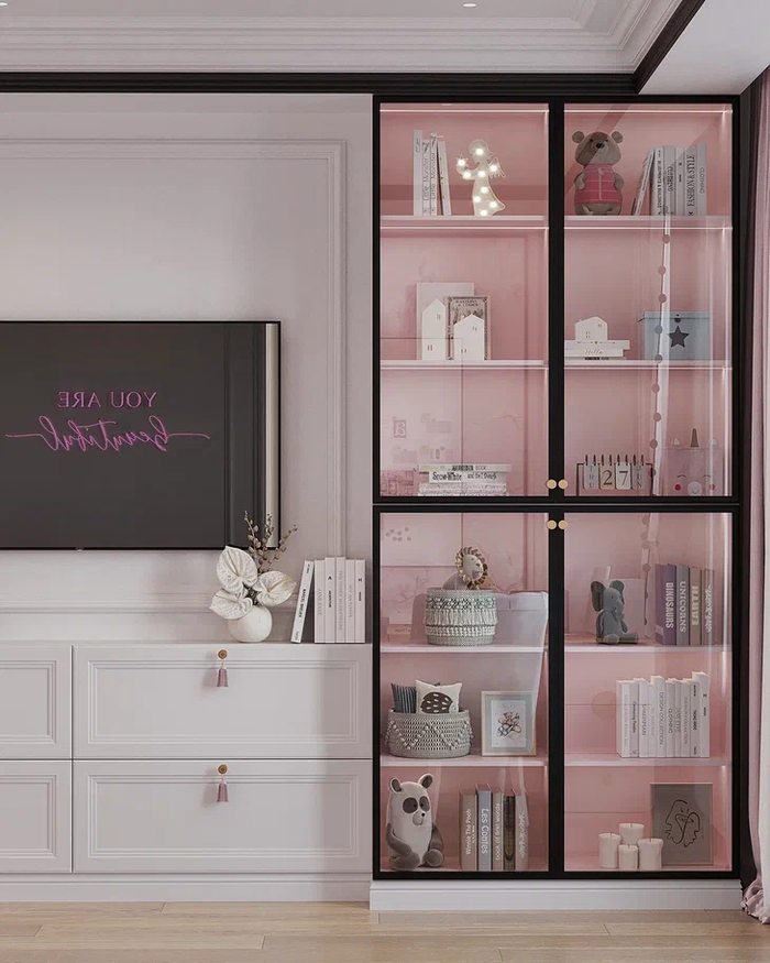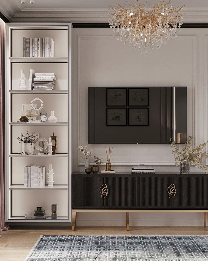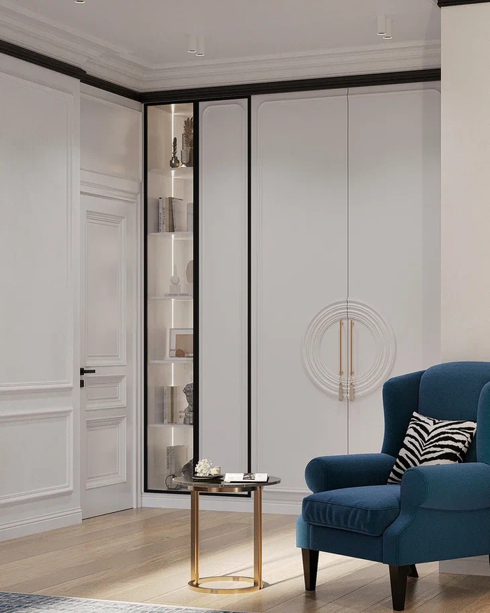 Открытые витрины с подсветкой используются для книг, игрушек и декоративных элементов, добавляя индивидуальность интерьеру. Графичные детали и текстиль поддерживают общий стиль квартиры.