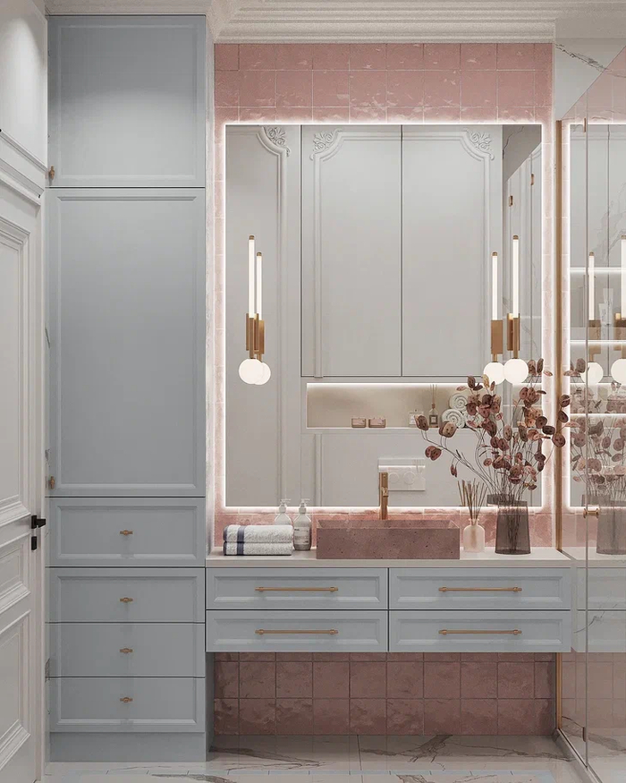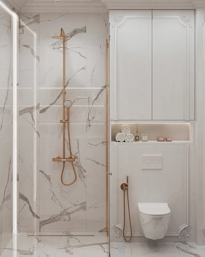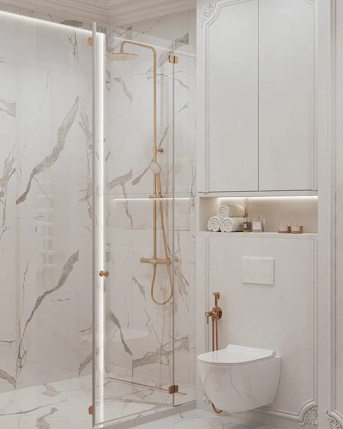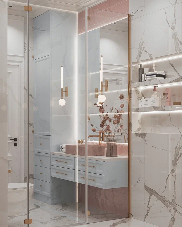 Душевая выполнена в светлой палитре с сочетанием мраморной плитки и пудровых оттенков, добавляющих глубину пространству. Латунная сантехника, встроенные системы хранения и подсветка подчёркивают геометрию и аккуратную проработку деталей.