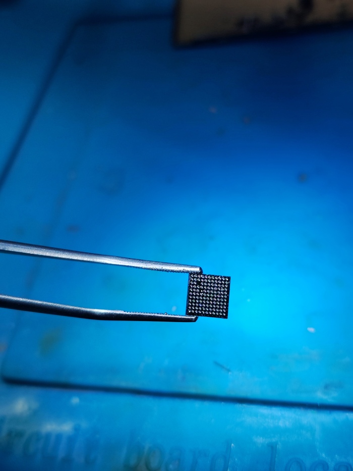 Отсутствующие резисторы и конденсаторы сами по себе не могли дать такую неисправность. Первым делом нужно было убедиться в надежности контакта BGA-чипов. Я снял все микросхемы, очистил посадочные места, отреболлил старые чипы и посадил их обратно, чтобы исключить плохую пайку.