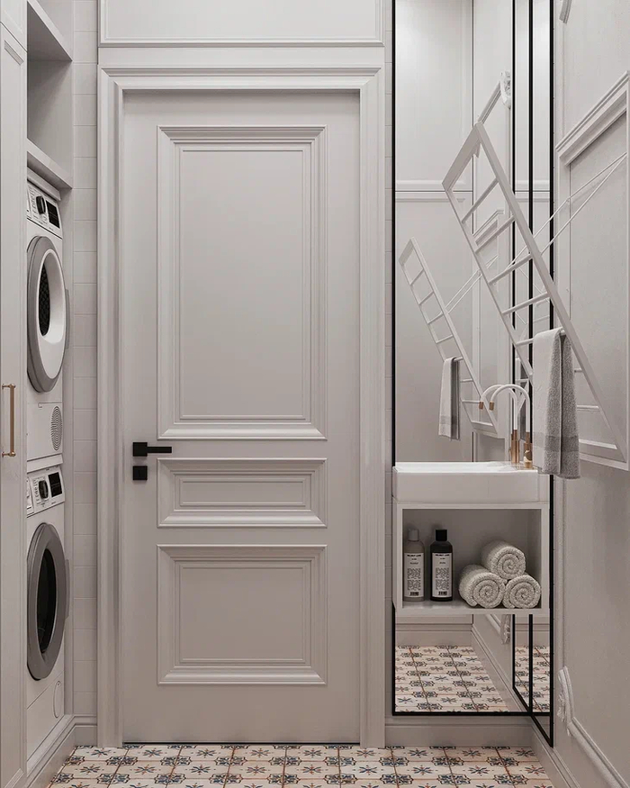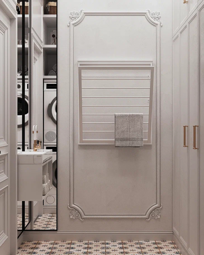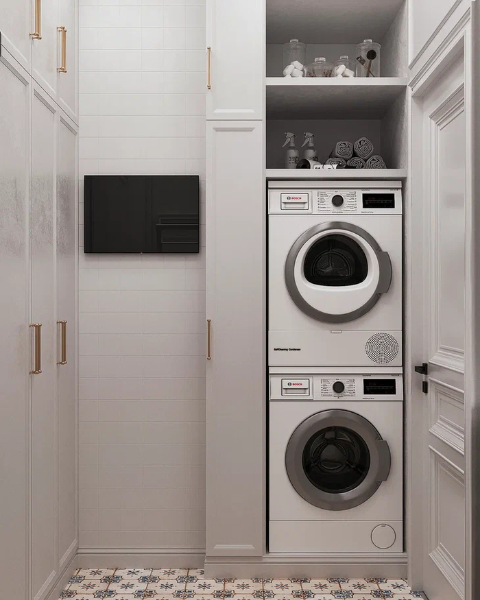 Постирочная спроектирована как отдельное хозяйственное помещение со стиральной и сушильной машинами, системами хранения и зоной для ухода за вещами.
