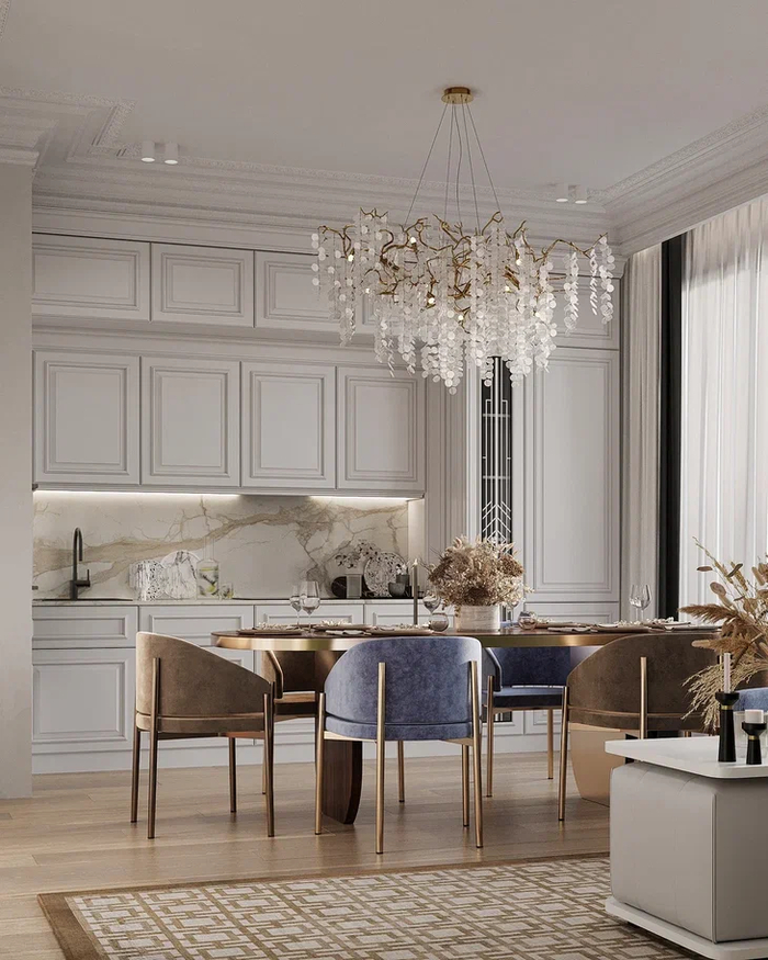 Кухонная зона выполнена в светлой неоклассике с чёткой графикой и встроенной техникой. От острова отказались, чтобы разместить крупный обеденный стол в центре комнаты, сделав его точкой притяжения.