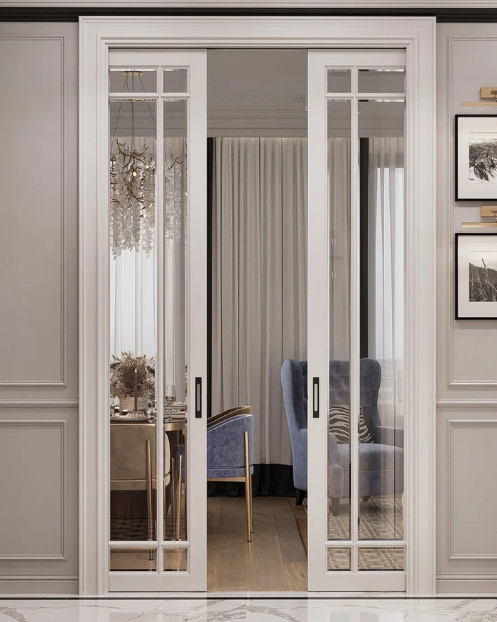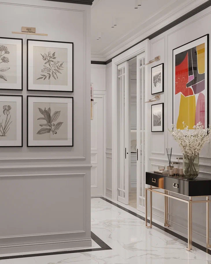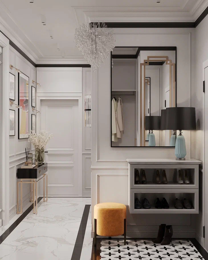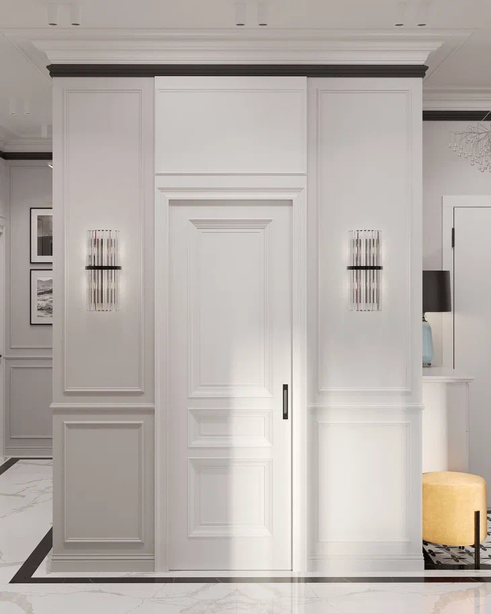Прихожая оформлена в светлой гамме с классическими стеновыми панелями и графичными чёрными акцентами, которые задают характер пространству с первых шагов. Зеркало на всю стену визуально расширяет холл и добавляет глубины.