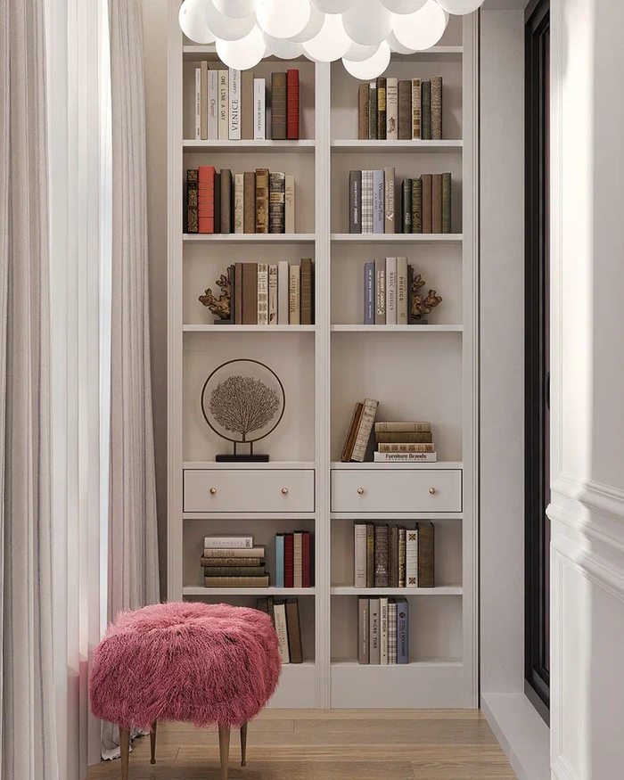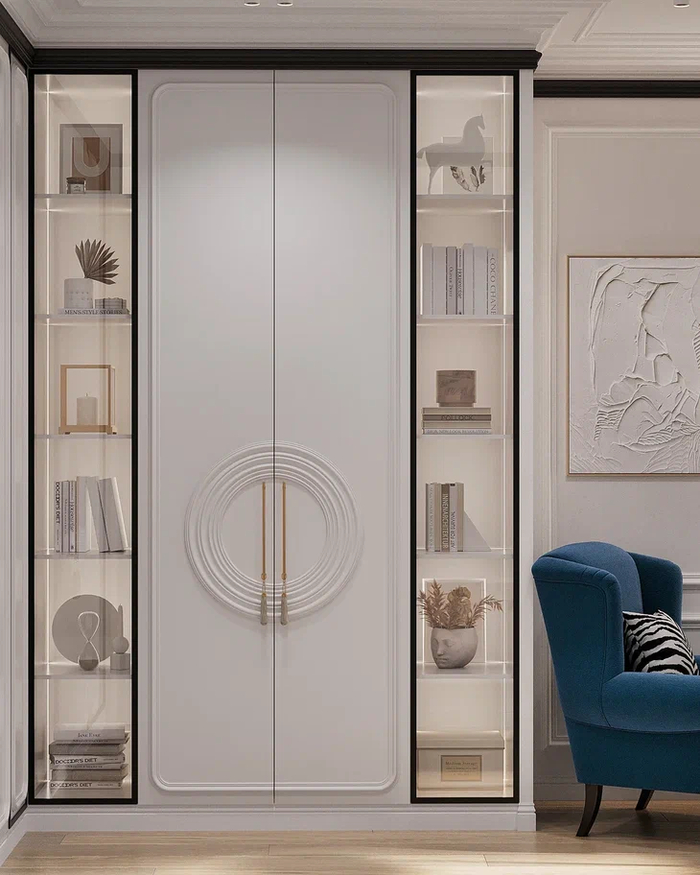 Встроенные системы хранения и стеклянные витрины выглядят частью архитектуры комнаты и не утяжеляют пространство. Зону отдыха дополняют кресло, спокойный текстиль и декоративный свет для вечернего сценария.