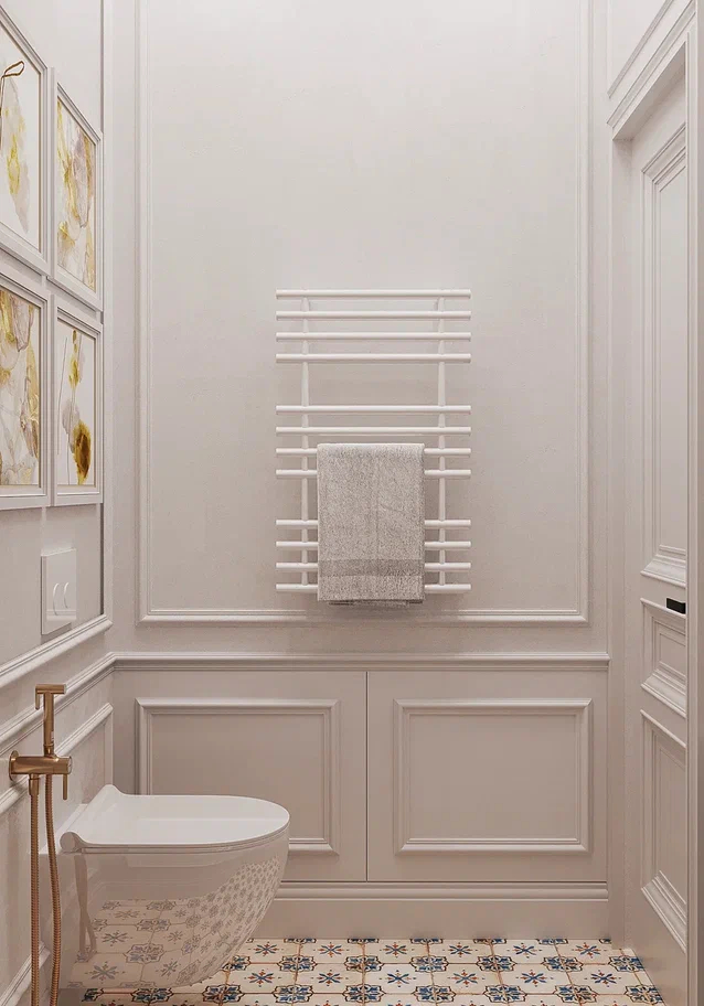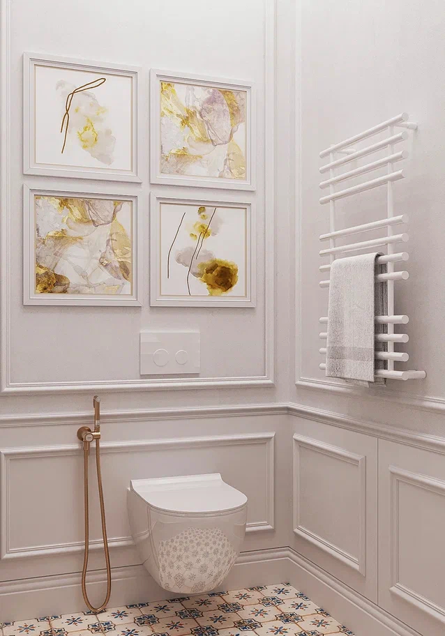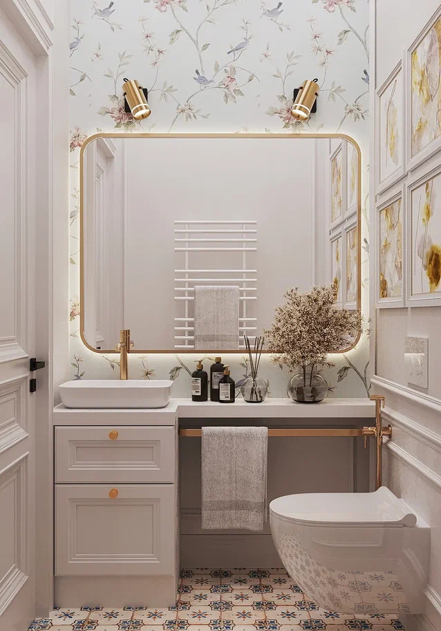 Гостевой санузел более декоративный по настроению: классические панели сочетаются с обоями с ботаническим рисунком и акцентной напольной плиткой.