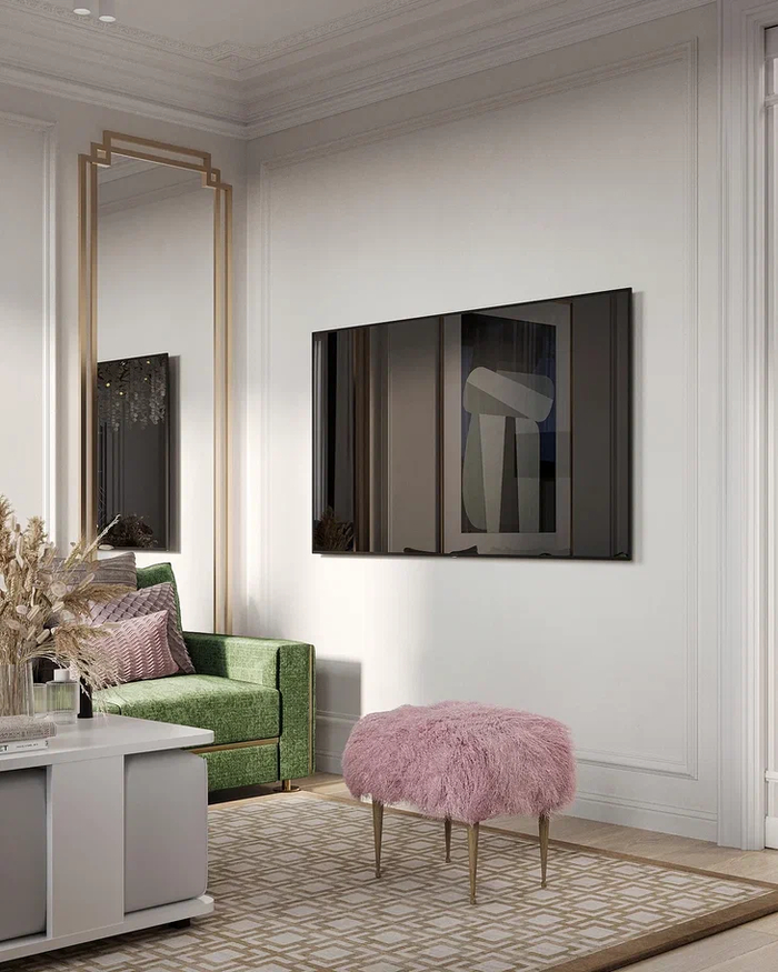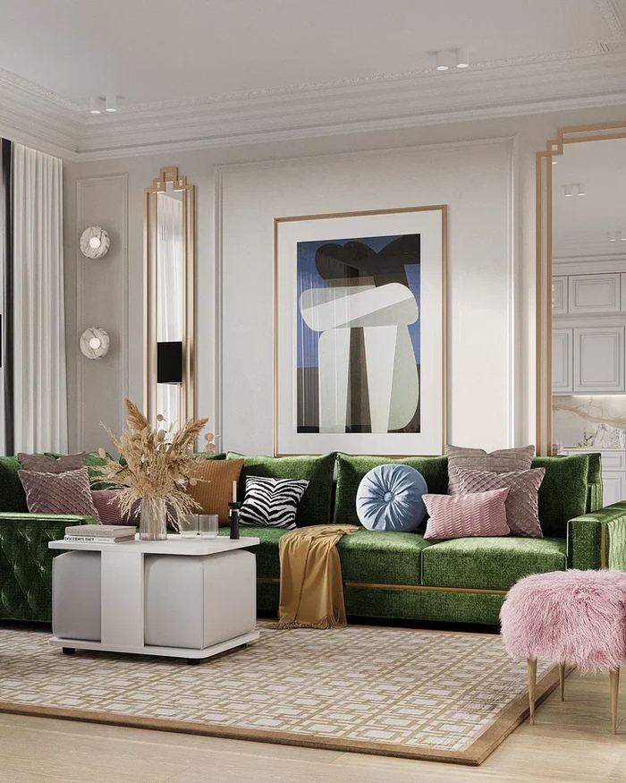 Гостиная построена на сочетании светлой основы и насыщенных акцентных предметов, включая зелёный диван, текстиль и арт-объекты. Пространство остаётся открытым и удобным как для отдыха, так и для приёма гостей.