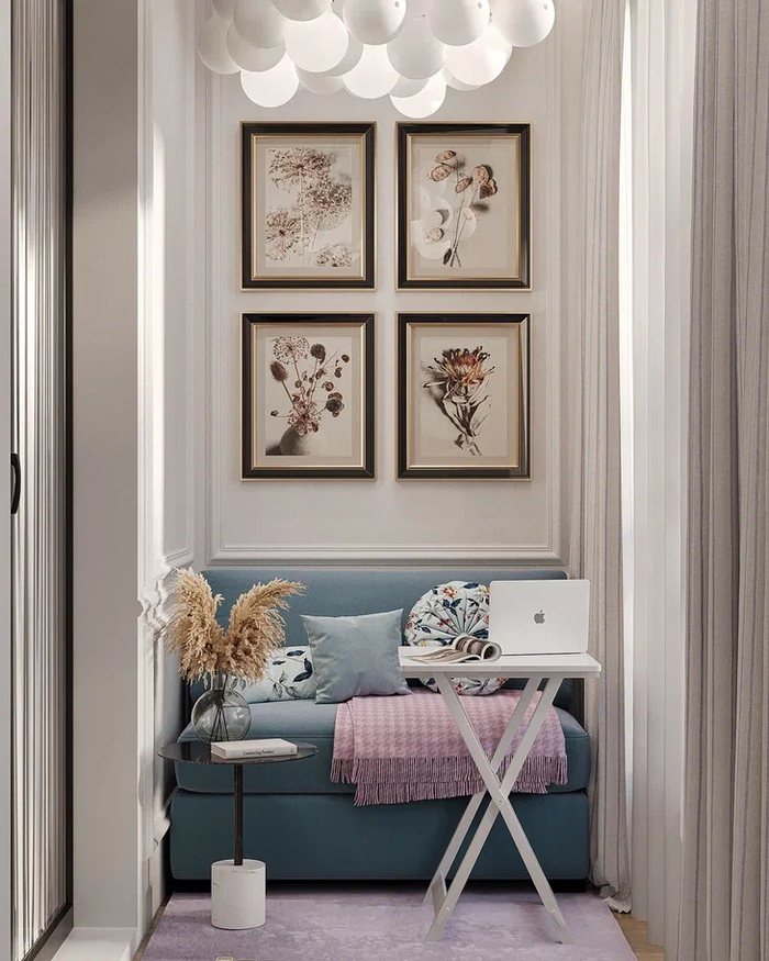 Балкон примыкает к спальне и был утеплён, чтобы использовать его круглый год. Здесь организована компактная рабочая зона с мягким сиденьем, системой хранения и панорамным остеклением.