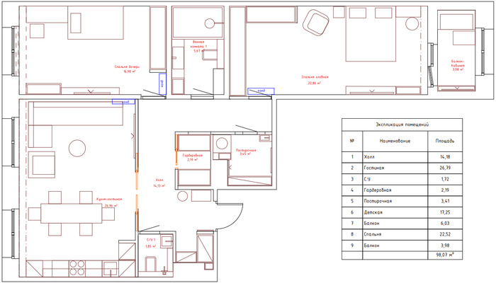 Планировка разделена на приватную часть с двумя спальнями и общественную зону с объединённой кухней-гостиной. Дополнительно предусмотрены две гардеробные в холле, отдельный санузел и утеплённый балкон при спальне, который используется как рабочее пространство.