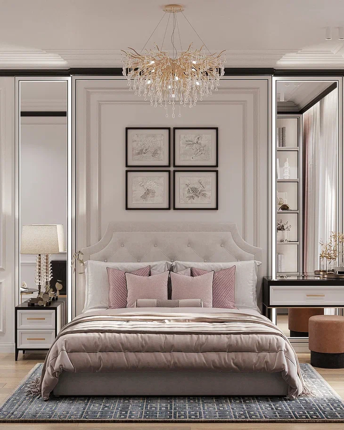 Спальня оформлена в светлой палитре с акцентом на тактильные материалы и аккуратные декоративные детали. Центральное место занимает кровать с мягким изголовьем, обрамлённая классическими панелями и симметричными светильниками с отсылкой к арт-деко.