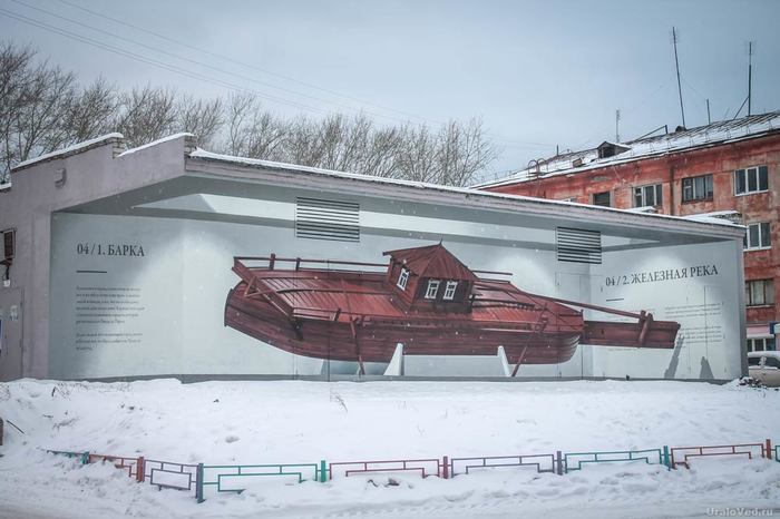 Один из рисунков расположен в Северском – северной части города Полевского (ул. Вершинина, 29а). На нем изображен макет барки. До постройки на Урале железных дорог заводскую продукцию отправляли по рекам. Изделия Полевского и Северского заводов сплавляли по реке Чусовой.
