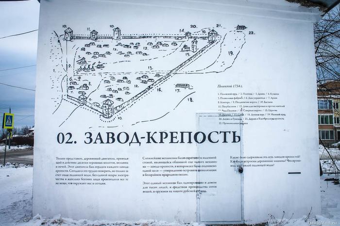 Через дорогу (за ул. Победы) на трансформаторной будке изображен объемный макет Полевского завода, а с торца нарисован план этого завода 1734 года.