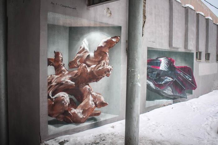 Объемные граффити на здании автостанции (ул. Володарского, 72) посвящены минералогии. Здесь можно увидеть шары из белого мрамора и малахита, друзу кварца, образцы бурого железняка, самородной меди и куприта.