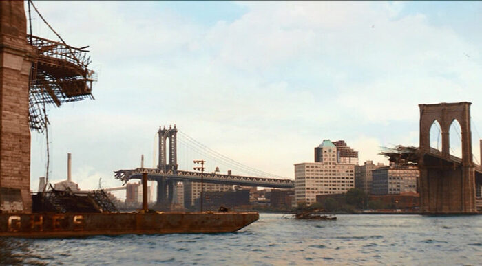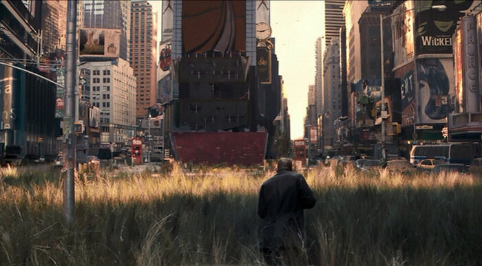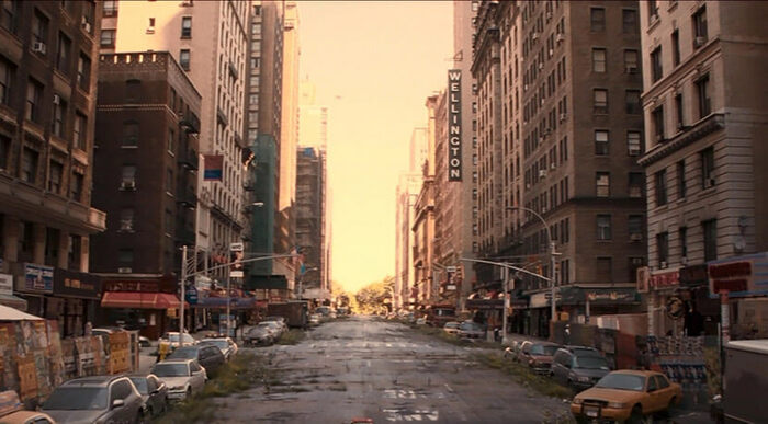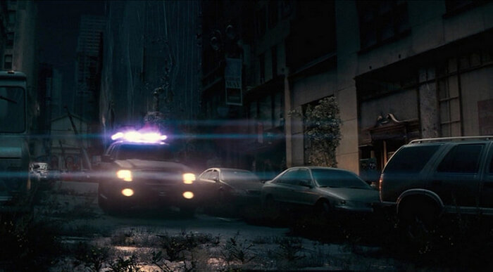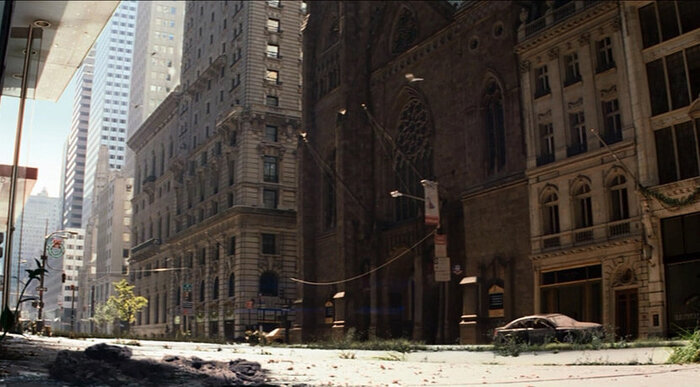 Над обветшанием города работали уже специалисты Imageworks, вымарывая из смонтированных кадров пустого города любое человеческое присутствие, включая случайных пешеходов или горящий свет в окнах. В итоге настоящие машины сменились ржавыми остовами, витрины были разбиты, а нарядные фасады зданий усыпаны звериным пометом и бетонной крошкой.