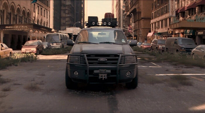 Внушительный внедорожник Ford Expedition третьего поколения (тип кузова Max, он же EL) стал для последнего выжившего ньюйоркца Роберта Невилла настоящим домом на колесах во время его разведывательных вылазок в гавань и для променада по магазинам.