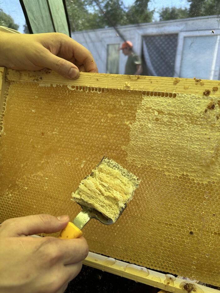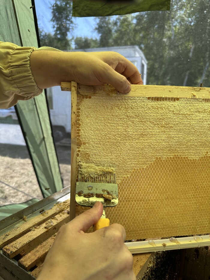 Берем вилочку и аккуратно распечатываем закрытые соты.