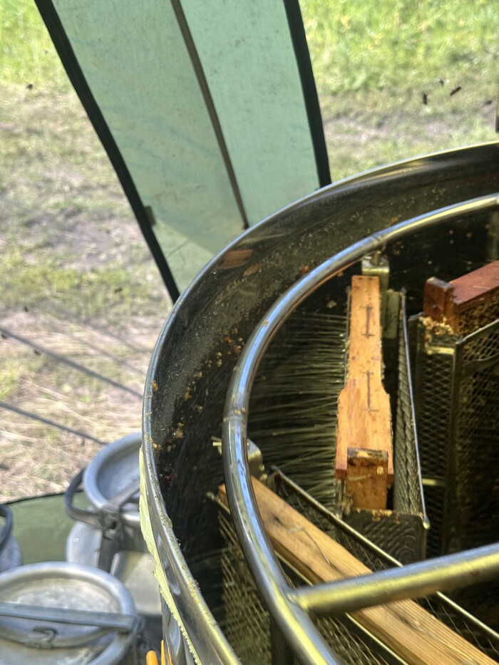 Медогонка работает как стиральная машина в режиме отжима, на 100-200 оборотах мёд выплескивается на стенки и стекает в накопитель внизу. После отжима пустые соты возвращаются в ульи.