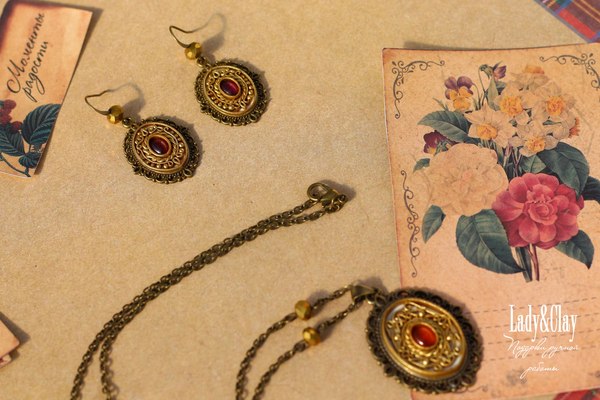 Размер: кулон 5,3 см. х 3,8 см.; серьги 2 см. х 1,4 см.; брошь 2,8 см. х 4,3 см.