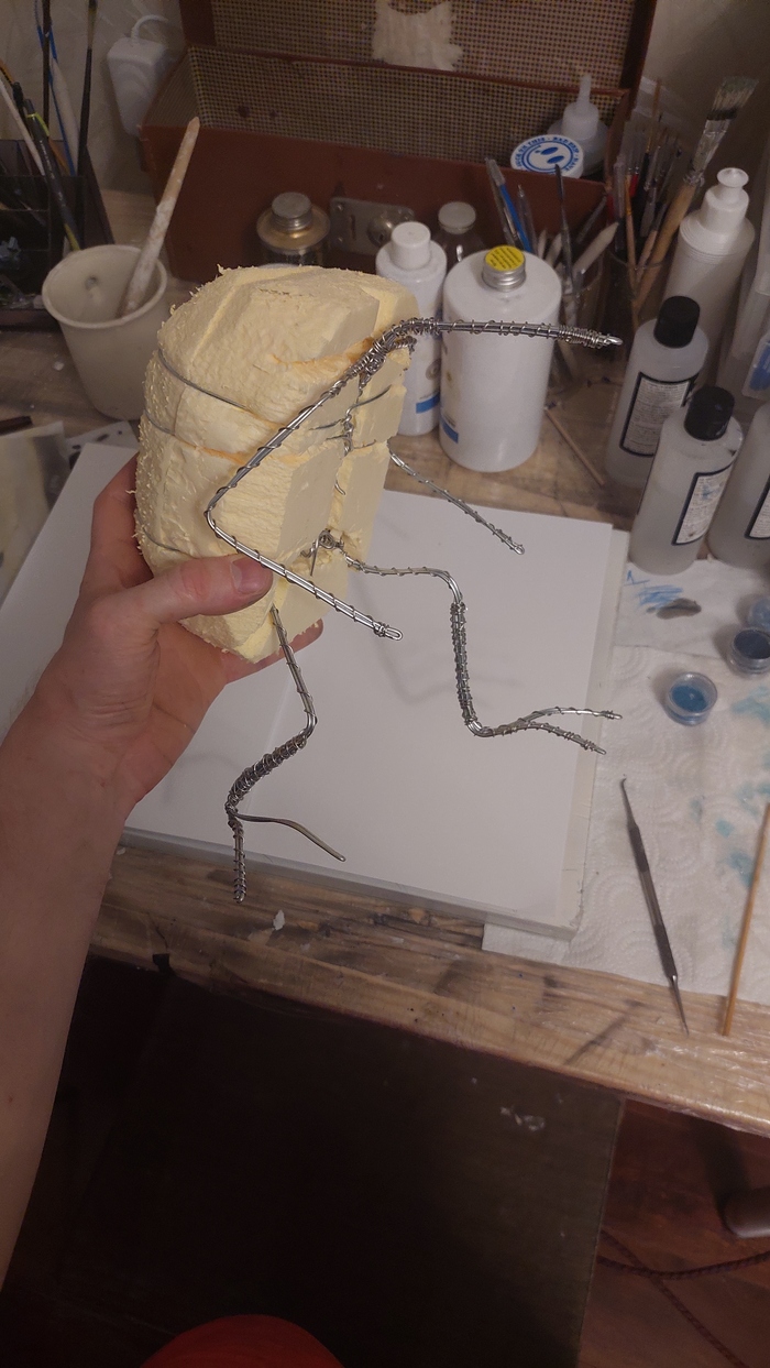 Для начала был сделан проволочный каркас, большие обьемы туловища, ног, рук и головы были заполнены экструдированным пенополистероломом.