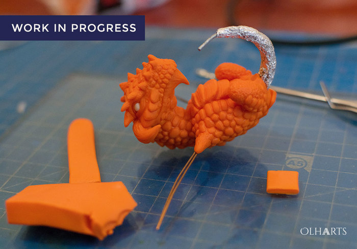 2. Сделать базовую тушку из фольги, нашампуренной на проволоку. С помощью жидкой пластики вживить верхние плавники, запечь, начать облепливать «мясом» из цернита, встроить хвост.