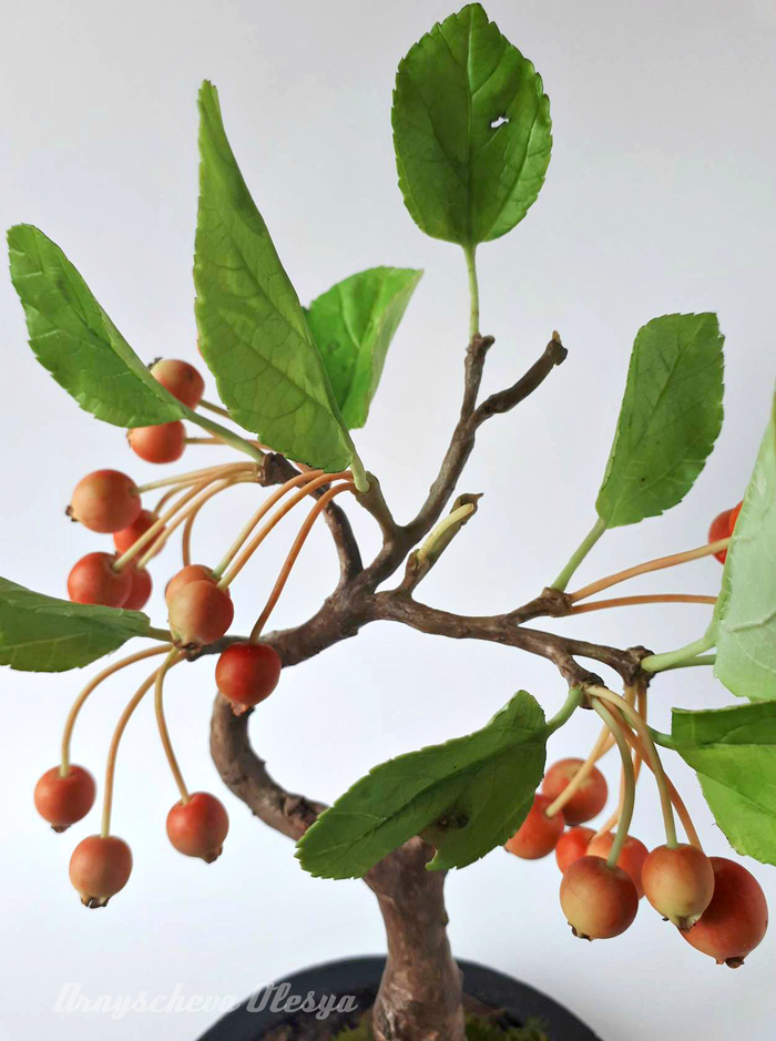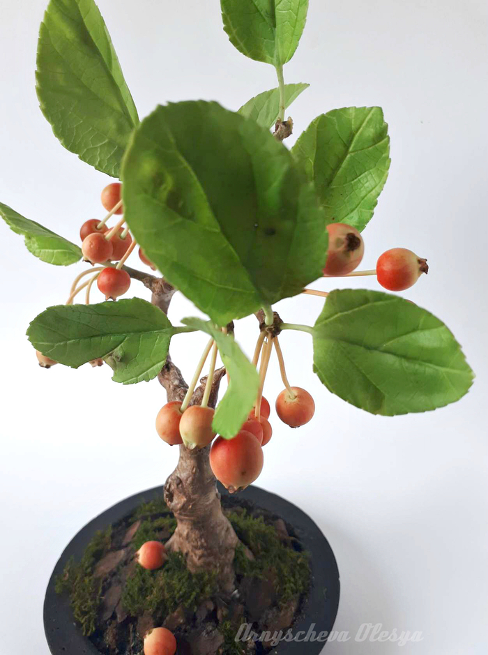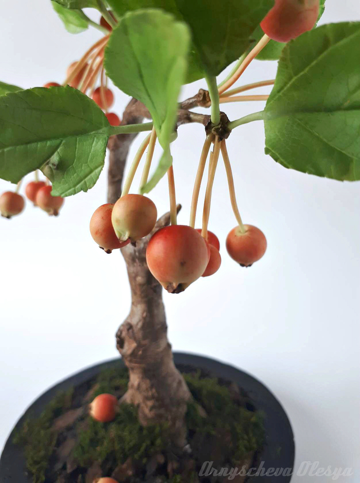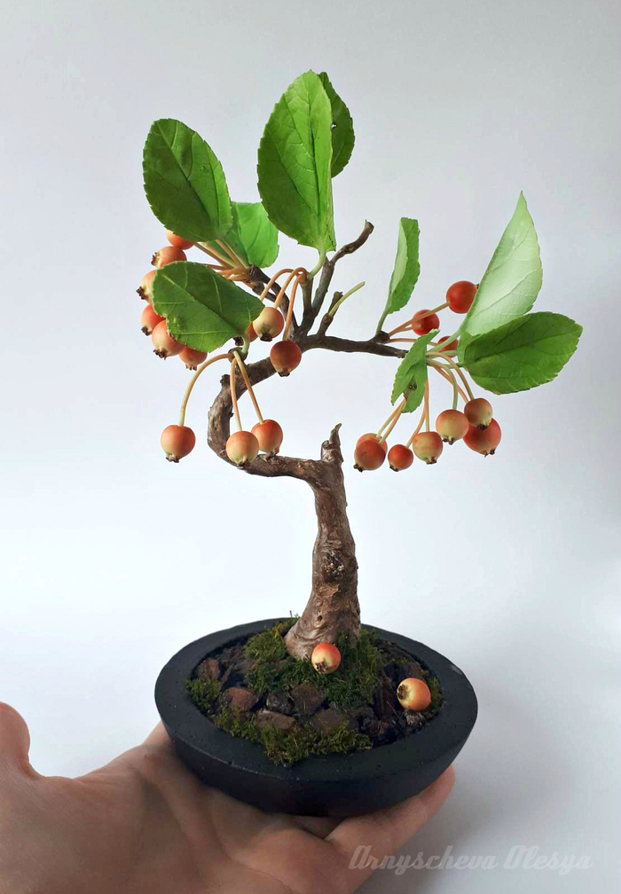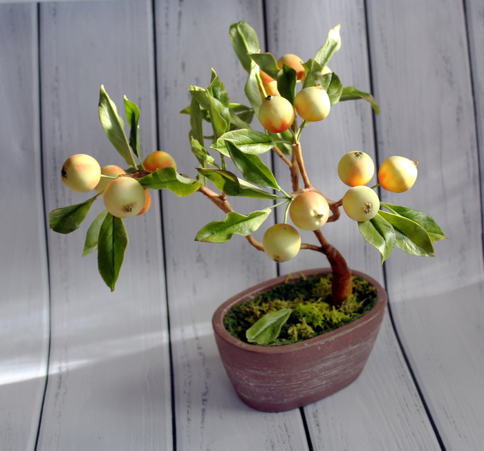 Люблю творить в свободном полете, когда нет рамок и ограничений, можно дать волю фантазии и наконец сделать то, что давно хотелось!Обожаю бонсаи и очень давно появилась идея слепить именно яблочный, было два варианта, цветущее деревце или с маленькими и румяными яблочками, т.к.мне приспичило очень, а тратить почти весь день на лепку тычинок для цветков не вдохновляло, остановилась на втором варианте.В общем,вот что получилось у меня.Материал застывающая на воздухе полимерная глина(среди мастериц холодный фарфор).Все детали гибкие и подвижные ,имеют проволочный каркас.