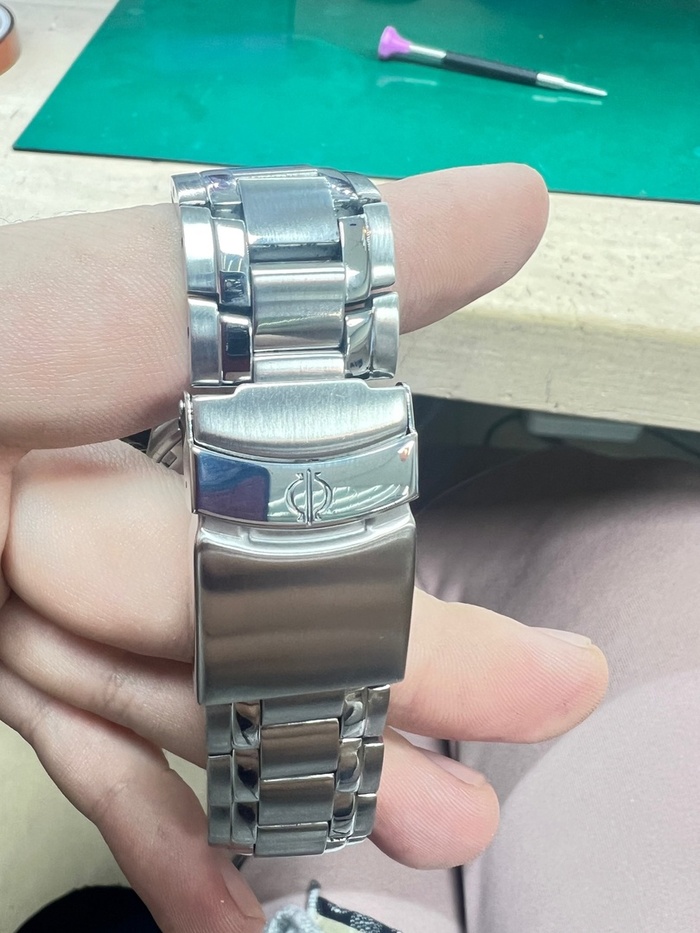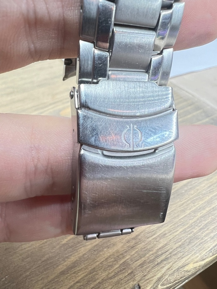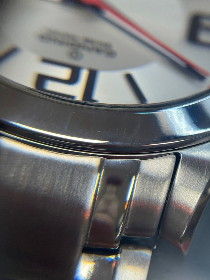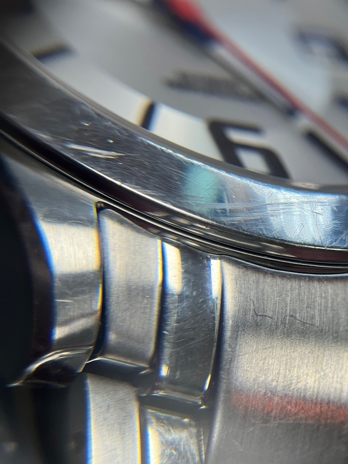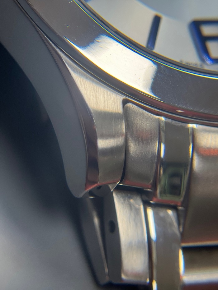 Выполнил комбинирован полировку с восстановлением корпус и браслета. Восстановил сатинирование браслета, ушек корпуса. Нанес глянец на безель, корпус браслет и застежку часов, восстановил сбитые углы