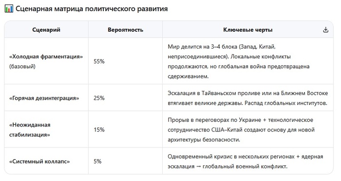📌 Важно: Прогнозы геополитики менее надёжны, чем экономические. Неожиданные события (смена режима, технологический прорыв, природный катастрофический сценарий) могут радикально изменить траекторию. Ключевой индикатор — уровень доверия между элитами великих держав, который сейчас находится на минимуме с 1945 года.