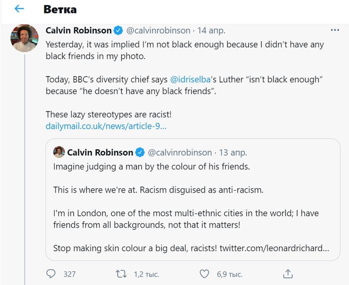 Руководитель телесети ВВС по "разнообразию" (diversity) Миранда Уэйланд, сказала, что Лютер Идриса Эльбы «не ощущается по-настоящему чернокожим, потому что у него нет чернокожих друзей». Ну и ещё потому, что он не ест карибскую еду так, чтобы все это видели.