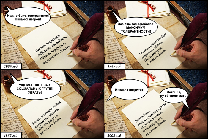 Ну и как тут не пошутить про Эстонию, которая в 2008 году, спустя 69 лет, сделала то же самое До этого книга на ее территории издавалась под оригинальным названием "Десять негритят".