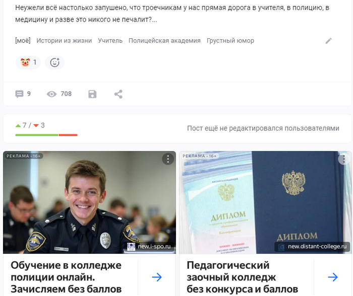 Это была реклама и я перешёл посмотреть, а там действительно готовят полицейских заочно, тут уже видимо не до академий, без ЕГЭ, без баллов, с любыми оценками, вот такие у нас будут полицейские и да, в сериале,,Полицейская академия" брали всех в прямом смысле, если кто помнит. И вот такая реклама у нас, там заочно обучают на полицейских в колледже, но конечно же платно...