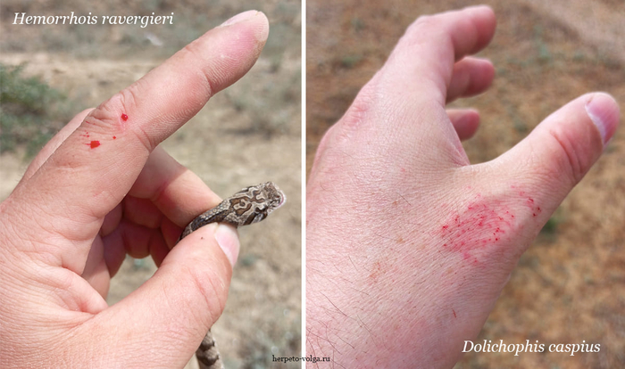 Теперь про личный опыт укуса, вы же этого ждали? На фото укусы от двух видов полозов: слева - разноцветного полоза (Hemorrhois ravergieri), справа - каспийского полоза (Dolichophis caspius). Они оба относятся к заднеборозчатым змеям (Opisthoglypha), т.е. клыки у них в глубине пасти. Но, смотрите какие разные укусы, хотя казалось бы...