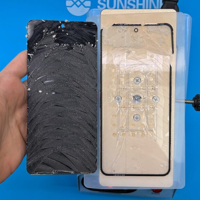 Склеиваем матрицу с новым стеклом в вакуумном прессе.