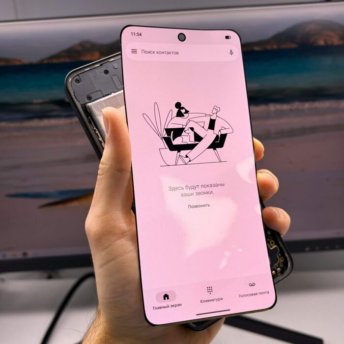 Видимо, сверхпрочное Panda Glass всё-таки не сильно защищает от потери денег после встречи с камнями. Но изображение показывает без пятен и полос, а значит, можно попробовать замену стекла Nothing Phone 3a и сэкономить на ремонте почти вдвое, чем мы и займёмся)