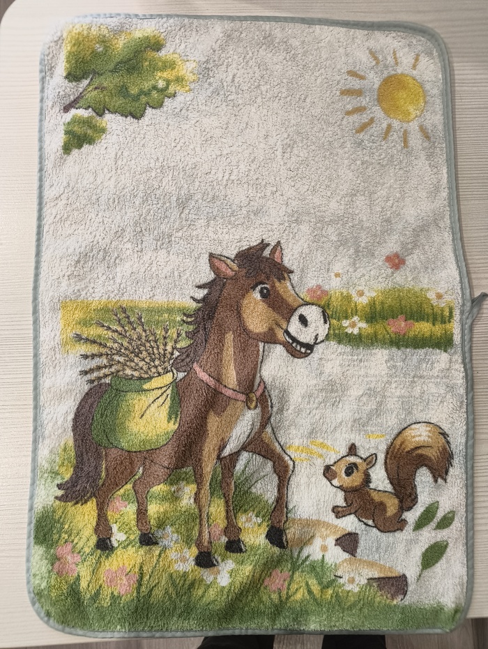 Стоимость рулона мне обошлась в 518 руб. Плотность ткани указана как 240 гр/м квадр. Наощупь плотная. А зачем она мне? Чтобы резать ее на полотенца для рук, для посуды, на кухню самое то. Вот и первое полотенце, какой надо размер такой и отрезал.