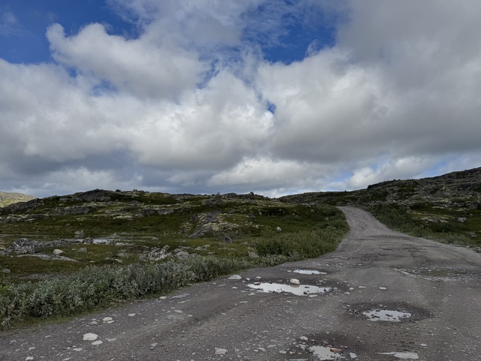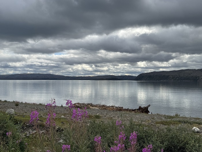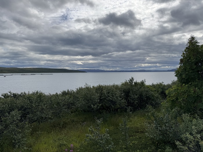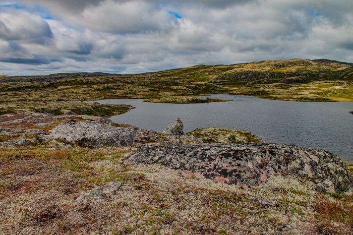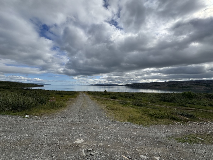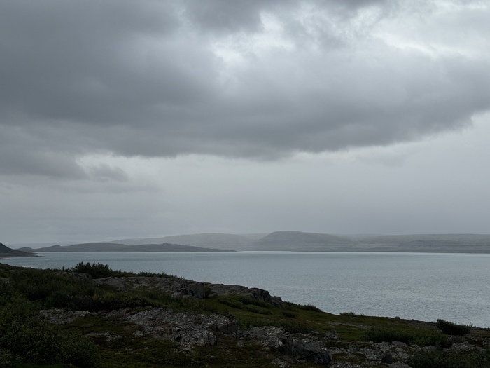 После перевала имеется место, где останавливаются многие туристы 69.619679, 31.954084. Мы же там останавливаться не стали и поехали сразу на полуостров Средний. Погода начала немного портиться и до вечера хотелось добраться до мыса Кекурский.