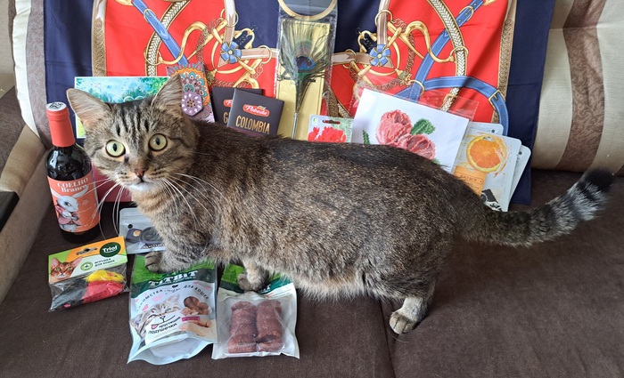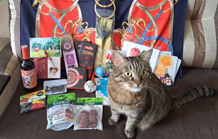 Моя Снегурочка оказалась очень шустрой, а почта России решила ей помочь, поэтому посылочка оказалась у меня уже на Масленицу. Вскрытие тоже было быстрым, всем домашним было интересно что же там прислали. Фото коробки нет, потому что домашние умудрились распаковать, пока я раздевалась да разувалась. Теперь подробнее о подарочках, общий вид и котоинспекция в конце.