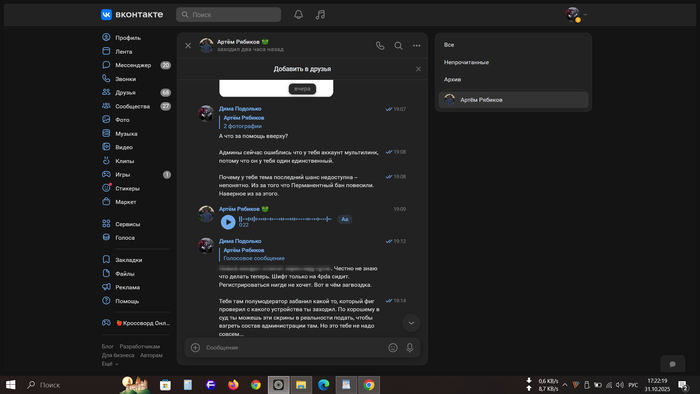 У меня есть ещё один друг вконтакте, который готов написать просьбу меня освободить из бана -- он теперь тоже потенциальный мульт?