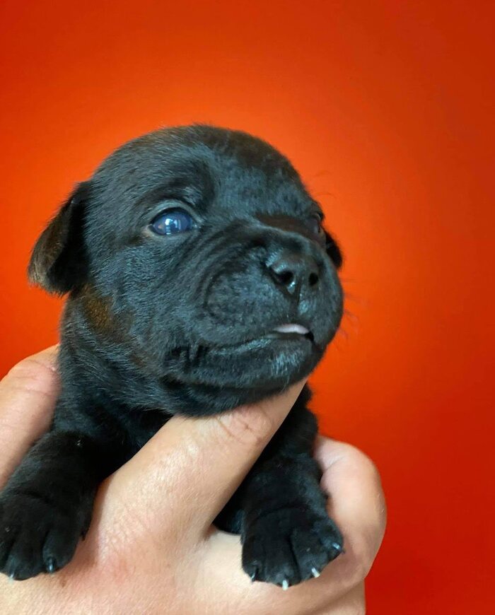 Проводим первую фотосессию чтоб было что потом показать будущим владельцам, да и самим чтоб оценить экстерьер. Пропорции тела уже особо не будут менятся, и в это время мы уже может отсечь тех кто точно идёт "на диван", и тех за кем будет интересно понаблюдать дальше, может и предложить в совладение вместо продажи. Оцениваем форму и величину черепа, посадку ушей и глаз, форму и ширину морды, а так же насколько широки ноздри. Последнее очень важно особенно для собак которые подут дальше в спорт. Стаффорды хоть и не относятся напрямую к брахицефальным породам, но всё же ими частично являются. Поэтому ширина ноздрей и открытость носовых ходов нам очень важна. Это обеспечит собаке сободное дыхание в любую погоду и при любом уровне активности.