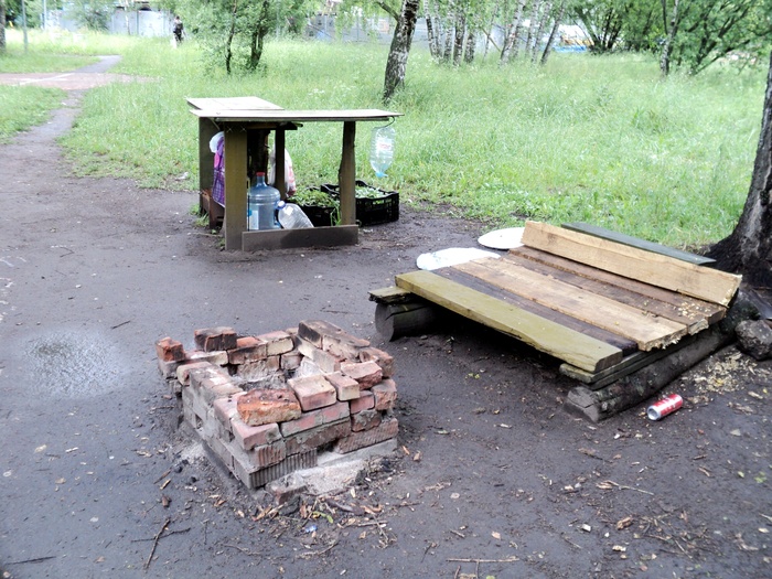 Рассортировал находки на лавочке возле мусорки, и отправился ко входу в парк со стороны Ферганского проезда. Здесь у меня имеется на примете ещё одно хорошее место для жорева водки на свежем воздухе, оно неофициальное. Просто на небольшой поляночке возле госпиталя для ветеранов войн №2 установлены пара столов, обустроено кострище с капитальным мангалом из кирпичей. Каждый вечер здесь кипит жизнь, местная алкашня гуляет не только до поздней ночи, но даже и до утра. И меня это злит, так прямо и хочется эти столы обосрать, но пока воздерживаюсь.