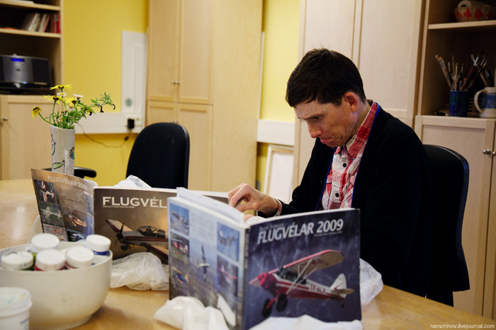 Каждый житель может работать в любой мастерской, но как правило большинство проявляют постоянство в своих увлечениях. Задача мастерских в том, чтобы найти увлечения и сильные стороны "особенных" жителей Солхеймара. Про этого парня говорят (к сожалению, я не запомнил почти ничьих имен), что самолеты - его настоящая страсть!