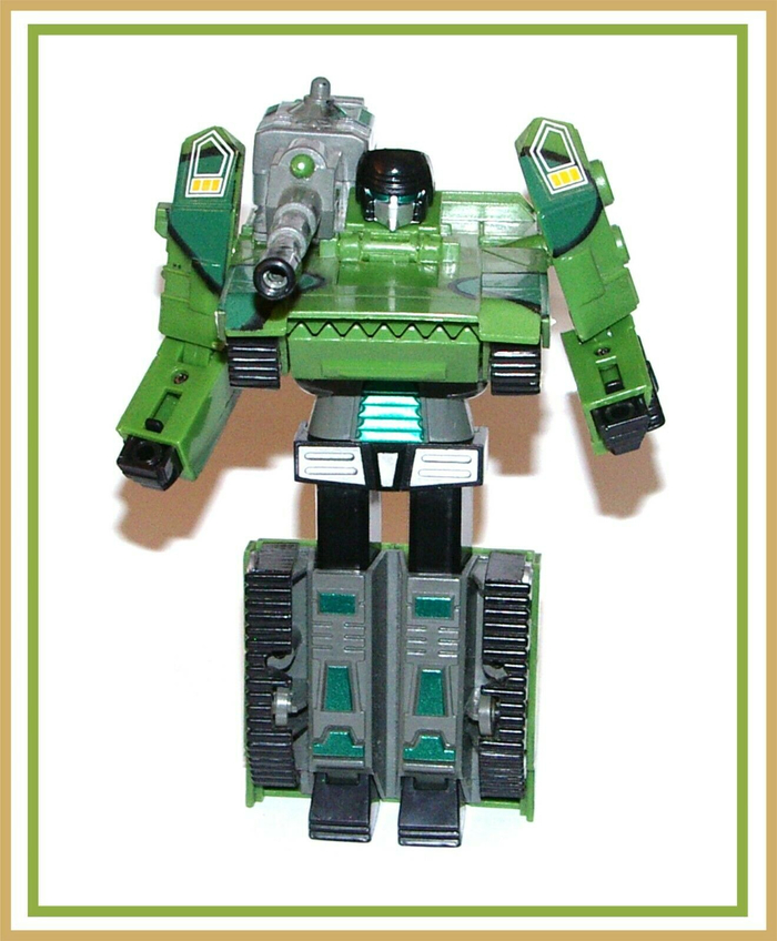 Вторая форма принималась после переворота робота вверх ногами, и толь закрытием сферического лица шлемом специальным, толь вдавливанием головы в корпус, после чего ноги становились руками и руки становились ногами наоборот, а с другого конца вытаскивалась маленькая голова выглядящая уже как полноценный бот.