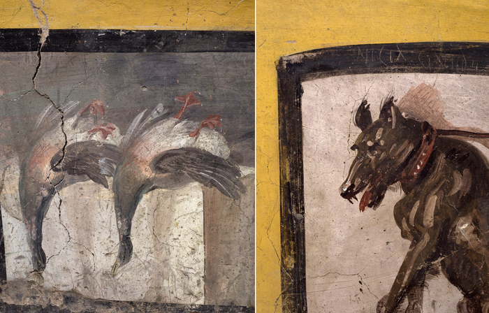 Вот фреска с морской нимфой — красивая, почти возвышенная. Вот мёртвые утки — проза жизни, еда. Вот оскорбление на стене — человеческая злость, мелкая, бытовая, сиюминутная. Вот скелет крошечной собаки — преданность, которая оказалась сильнее смерти.