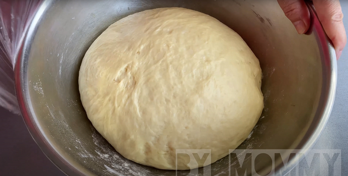 4) Спустя это время, тесто увеличится вдвое и хорошо поднимется. Мы его снова замешиваем в течение нескольких минут, накрываем пленкой и оставляем в теплом месте на 30 минут - час, пока оно не поднимется в два раза.