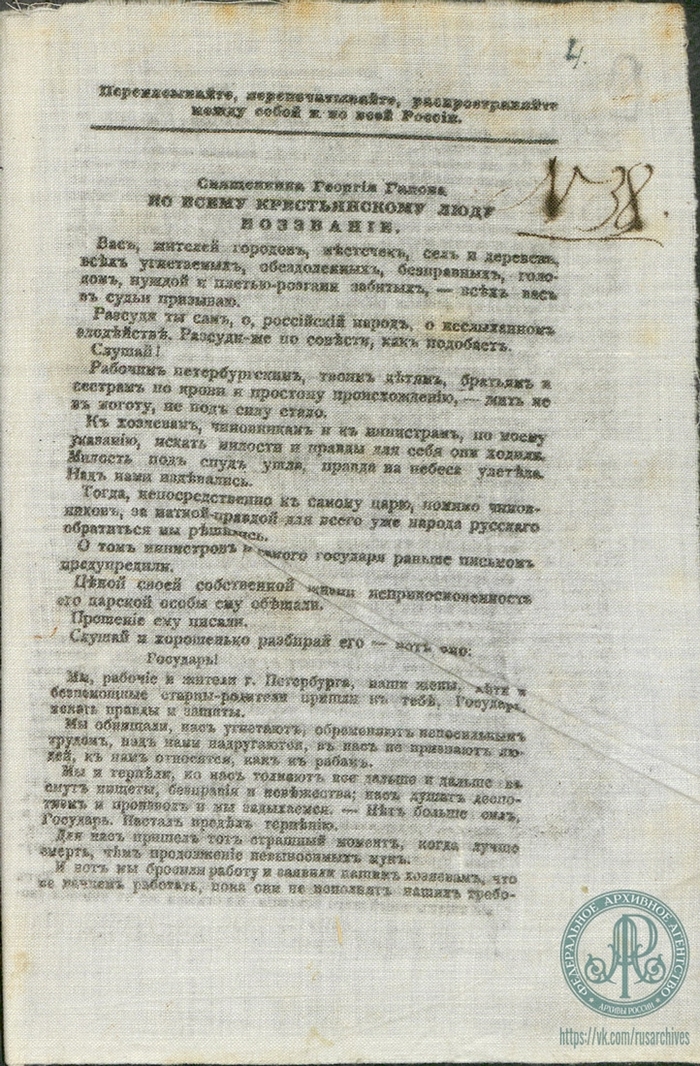 В субботу, 8 января, поп выступил перед «Собранием» с последней речью. В ней он убеждал участников организации прийти на Дворцовую площадь вместе с женами и детьми. По словам очевидцев, он заклинал рабочих «не прикасаться к спиртным напиткам, не иметь при себе оружия…, не применять грубой силы при столкновении с властями». Демонстрация должна была носить исключительно мирный характер.
