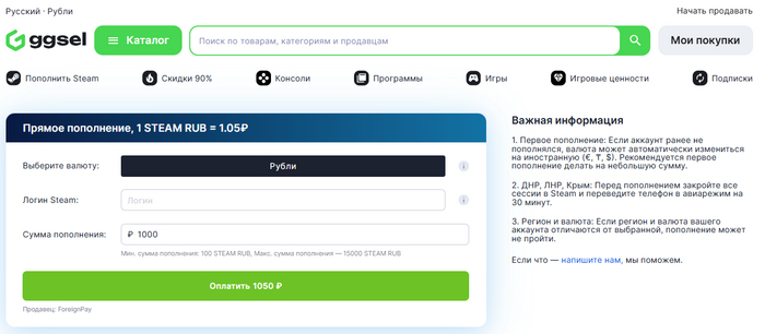 Переходите на ggsel.net — торговую площадку, где вы найдете игры для ПК и консолей, DLC, сможете пополнить баланс популярных игровых и неигровых сервисов, купить и продать игровой аккаунт. И все это — по выгодным ценам!
