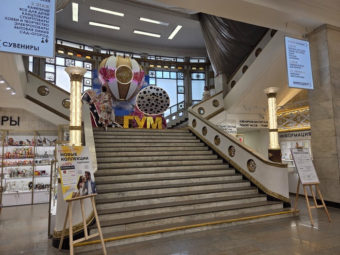 Ассортимент сегодня тоже любопытный: одежды, обуви посуды и прочего - полно, причём много локальных брендов. Стиль можно назвать "нью-советский" - что-то очень знакомое, но с современными элементами. Цены, правда, на уровне. Зато, оформив карту ГУМа, можно ловить хорошие скидки и бонусы. Качество вещей радует - всё, что отсюда увозил, до сих пор служит исправно. 😜