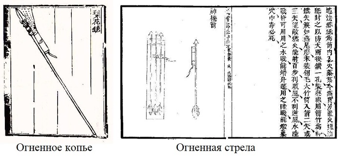 Самый распространенный тип огнестрельного вооружения. Фактически эта стрела или копье, которую движет реактивная тяга от поджигания пороха, располагавшегося в сосуде и работавшее от фитиля. Такой снаряд также сам помещался в сосуд, чаще это был бамбук. Дальность могла быть разной. Как и убойная сила. Примечательно что описание применения этого типа вооружения есть в китайских текстах 1044 года. А в последний раз огненные стрелы применялись аж в 1860 году, против французов во Второй Опиумной Войне.