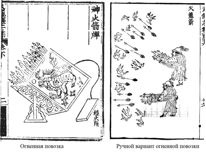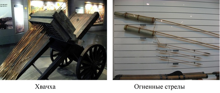 Дальнейшим развитием этих “стрел” стали сосуды с кучей стрел, которые производили залп с одного фитиля. Они были как ручными, которые мог держать один солдат, так и целые повозки, набитые такими стрелами. Именно эти “ огненные повозки” были предшественниками систем залпового огня. Зона поражения этих “огненных повозок” была достаточно большой и запуск требовал лишь одного человека. Это давало колоссальное преимущество в обороне. Это наглядно показало использование Кореей этих “огненных повозок”, во время японского вторжения в XVI веке. Эти огненные повозки по-корейски назывались Хвачха. Во время осады корейской крепости Хенджу, корейцев было лишь 2300 человек, среди которых половина были не воины. Против них была 30 000 японская армия. Но на стороне корейцев было несколько Хвачха вместительностью от 100 до 200 стрел. Хвачхва требовали много времени на зарядку. Но одновременный залп этих орудий давал убийственный эффект. Японцы 9 раз атаковали крепость, потеряли убитыми 10 000 человек, но не смогли захватить его. Стоить также отметить, что в программе “Разрушители мифов” была произведена реконструкция Хвачха, где они смогли доказать состоятельность и эффективность данного вида оружия.